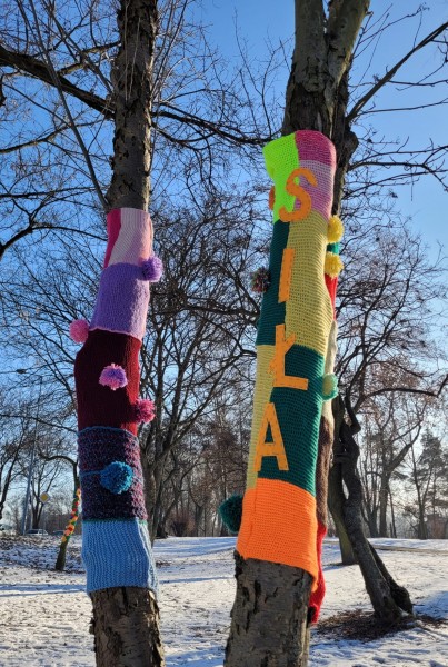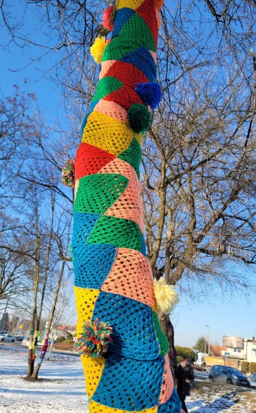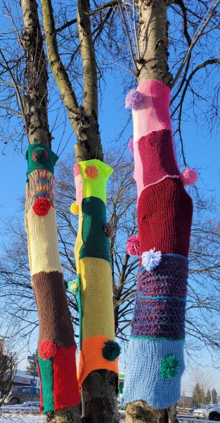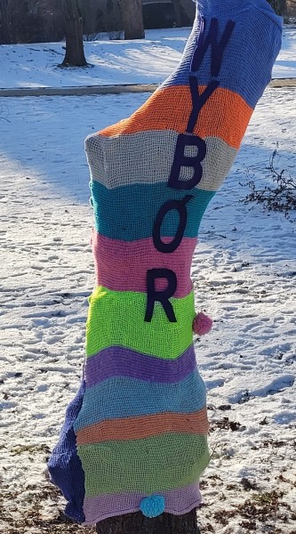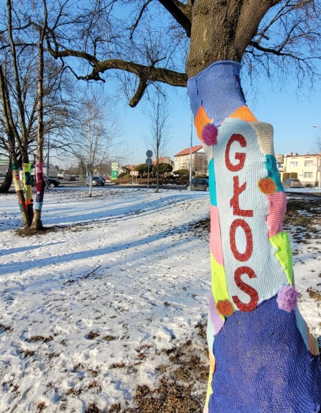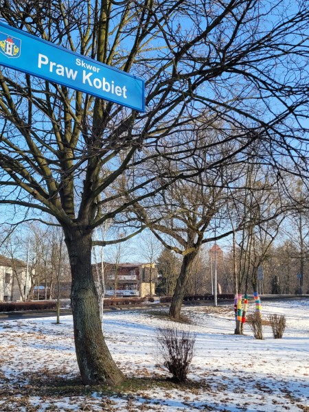 Na naszym skwerze Praw Kobiet zrobiło się bardzo kolorowo za sprawą pierwszego happeningu przygotowanego przez babcie i dziadków z Dzienny Dom Pomocy w Oświęcimiu oraz Stowarzyszenie "Pokolenia" przy DDP oraz jego pracowniczki. Kolorowe „szaliczkowe otulinki” na drzewa - symbol ciepła - cieszą oko, ale są też źródłem refleksji za sprawa umieszczonych tam słów: GŁOS, WYBÓR, SIŁA.